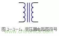 變壓器來改變輸入到后級電路的電壓。電源變壓器由初級繞組、次級繞組和鐵芯組成。初級繞組用來輸入電源交流電壓,次級繞組輸出所需要的交流電壓。通俗的說,電源變壓器是一種電→磁→電轉(zhuǎn)換器件。即初級的交流電轉(zhuǎn)化成鐵芯的閉合交變磁場,磁場的磁力線切割次級線圈產(chǎn)生交變電動勢。次級接上負(fù)載時(shí),電路閉合,次級電路有交變電流通過。變壓器的電路圖符號見圖2-3-1。