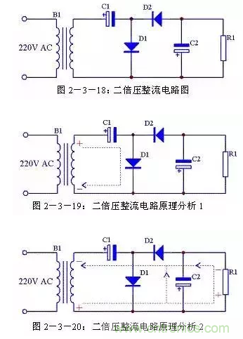 二倍壓整流電路還有另外一種形式的畫法,見圖2-3-21,其原理與圖2-3-18完全一致,只是表現(xiàn)形式不一樣。