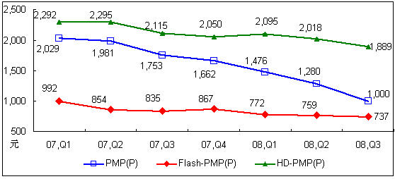 2007年Q1-2008年Q3中國PMP播放機市場不同存儲介質產品價格走勢