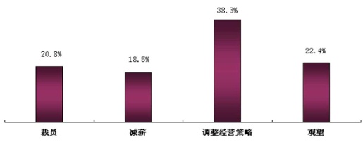 此項(xiàng)調(diào)查結(jié)果出乎我們的意料,選擇裁員的企業(yè)已經(jīng)占到了20.8%,但是多數(shù)企業(yè)還是選擇了調(diào)整經(jīng)營(yíng)策略。我們特別希望有遠(yuǎn)見的企業(yè)不要把裁員作為應(yīng)對(duì)危機(jī)的主要措施,這也不符合我們“和諧社會(huì)”的主旋律。只要能正確的面對(duì),認(rèn)真分析企業(yè)的優(yōu)勢(shì),研究市場(chǎng)的動(dòng)向,合理配置企業(yè)資源,充分發(fā)揮員工的潛力,調(diào)動(dòng)員工的積極性,企業(yè)一定會(huì)有新的轉(zhuǎn)機(jī)。企業(yè)如能和員工共克時(shí)艱,就會(huì)加深員工對(duì)企業(yè)的感情,這種情感會(huì)轉(zhuǎn)化為企業(yè)的一種優(yōu)勢(shì)資源。(見圖表四)