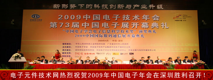 4月9日,“2009年中國電子技術年會”與“第73屆中國電子展暨2009中國國際數(shù)碼通信展”開幕式同時在會展中心隆重召開。本屆年會由工業(yè)和信息化部、深圳市人民政府指導,中國電子學會、中國電子信息產(chǎn)業(yè)集團中國電子器材總公司主辦,電子元件技術網(wǎng)(www.plusdive.com.cn)是活動特別支持網(wǎng)站,年會以“新形勢下的科技創(chuàng)新與產(chǎn)業(yè)升級”為主題。原信息產(chǎn)業(yè)部部長、中國電子學會理事長吳基傳,工業(yè)和信息化部副部長婁勤儉,工業(yè)和信息化部有關司局領導,深圳市、中國電子信息產(chǎn)業(yè)集團公司有關領導及多位院士、專家出席了會議。