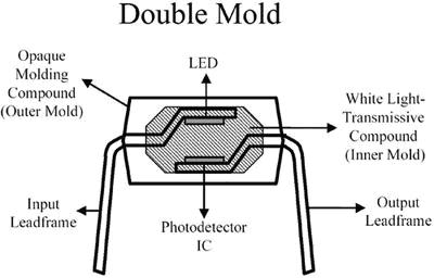 然后,組合好的引線框使用白色光傳導(dǎo)化合物進(jìn)行澆鑄,構(gòu)成光導(dǎo)裝置,把光從LED傳送到IC光電檢測器上。白色化合物還提供了高壓絕緣功能。最后,得到的組件使用不透明的化合物澆鑄,構(gòu)成最終的封裝輪廓。