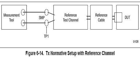 在USB3.0的TX的眼圖和抖動(dòng)測(cè)試中,測(cè)量的是待測(cè)試信號(hào)經(jīng)過(guò)參考測(cè)試信道后TP1點(diǎn)的眼圖和抖動(dòng)。如下圖4中的Reference test channel即為參考測(cè)試信道,在規(guī)范中定義了long channel、short channel和3米電纜三種參考測(cè)試信道。如果使用long channel或者較長(zhǎng)電纜,信號(hào)到達(dá)接收端時(shí)衰減比較大,眼圖已經(jīng)閉合,USB3.0芯片接收端使用了CTLE均衡器對(duì)信號(hào)進(jìn)行均衡后(CTLE均衡器介紹見(jiàn)本文最后一部分),信號(hào)眼圖的質(zhì)量將大大改善,所以要求測(cè)試儀器分析出CTLE均衡器處理后信號(hào)的眼圖和抖動(dòng)。