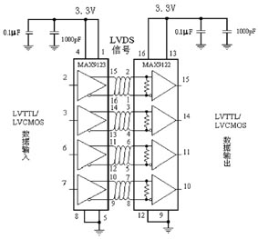 圖2是采用MAXIM公司的一片MAX9123驅(qū)動器和一片MAX9122接收器設(shè)計的一個4通道LVDS點對點連接的單工接口。該接口工作電源為+3.3V,驅(qū)動器輸入和接收器輸出數(shù)據(jù)為LVTTL/LVCMOS電平。