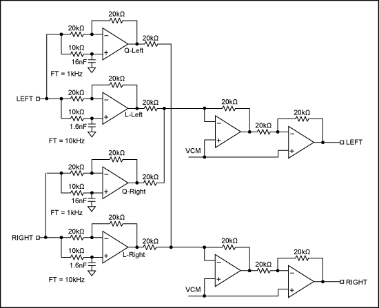 無(wú)源方案可以實(shí)現(xiàn)該電路,但是更通用的方法是有源電路(圖7)。對(duì)于線性信號(hào)(相應(yīng)的輸入通道),電路呈現(xiàn)為一個(gè)ft=10kHz的相移濾波器,對(duì)于積分信號(hào)(另一路輸入),電路呈現(xiàn)為一個(gè)ft=1kHz的相移濾波器。目的是使線性輸入信號(hào)和積分信號(hào)之間在音頻帶寬1kHz至10kHz范圍內(nèi)呈現(xiàn)90°相移。