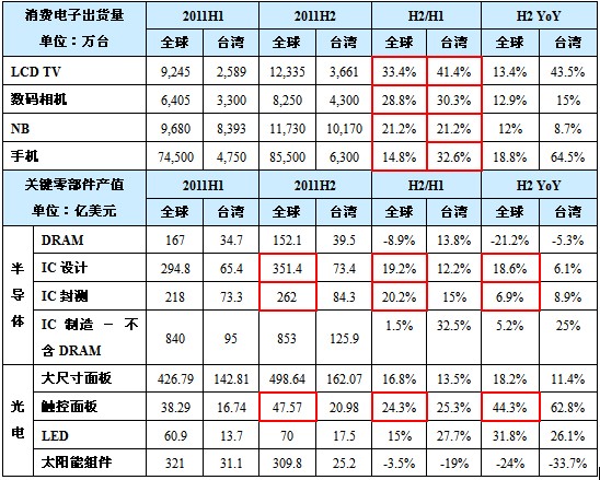 2011上下半年主要消費電子及關(guān)鍵零組件成長幅度比較