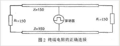 ②阻抗不連續(xù),顧名思義,與光從一種媒質(zhì)進(jìn)入另一種媒質(zhì)時(shí)所引起的反射是相似的。信號(hào)在傳輸線末端突然遇到電纜阻抗很小甚至沒有,信號(hào)在這個(gè)地方就會(huì)引起反射。消除這種反射最常用的方法,是在電纜的末端跨接一個(gè)與電纜的特性阻抗同樣大小的終端電阻,使電纜的阻抗連續(xù)。由于信號(hào)在電纜上的傳輸是雙向的,因此,在通訊電纜的另一端同樣要跨接一個(gè)相同大小的終端電阻,如圖2所示。