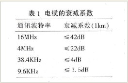導(dǎo)線的電阻對(duì)信號(hào)的影響很小,可以忽略不計(jì)。電纜的分布電容C主要是由雙絞線的兩條平行導(dǎo)線產(chǎn)生。信號(hào)的損失主要是由于電纜的分布電容和分布電感組成的LC低通濾波器。通訊波特率越高,信號(hào)衰減也會(huì)越大。常規(guī)電纜的衰減系數(shù)見表1.