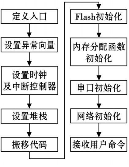 本設(shè)計中采用了帶有SNMP協(xié)議的μClinux操作系統(tǒng),實現(xiàn)方式簡單。不僅完成了串行接口到網(wǎng)絡(luò)接口的轉(zhuǎn)換,還使用戶可以通過監(jiān)控界面按照SNMP協(xié)議標(biāo)準(zhǔn)進(jìn)行統(tǒng)一管理。對于μClinux系統(tǒng)U-boot是最合適的Bootloader,其設(shè)計過程如圖5所示。