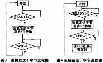 (2)軟件部分:單片機(jī)為主控制器,首先查詢從機(jī)狀態(tài)標(biāo)志位READY是否為1,判斷是否可以與從機(jī)通信。從機(jī)準(zhǔn)備就緒時(shí),單片機(jī)可裝載1字節(jié)發(fā)送數(shù)據(jù),啟動(dòng)CPLD內(nèi)部SPI接口電路,查詢并等待SPI傳輸結(jié)束標(biāo)志位SPIF為1,完成一字節(jié)數(shù)據(jù)傳輸,如此重復(fù)。圖3、圖4為主機(jī)發(fā)送與接收1字節(jié)流程圖。