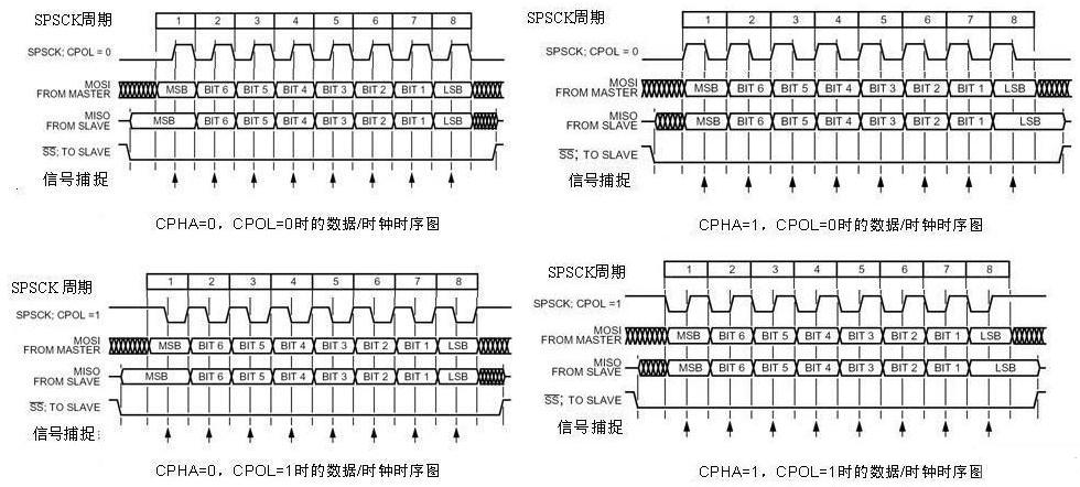 當(dāng)CPHA=1、CPOL=1時SPI總線工作在方式4。與前者唯一不同之處只是在同步時鐘信號的上升沿時捕捉位信號,下降沿時下一位數(shù)據(jù)上線。