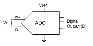 用于將傳感器信號(hào)數(shù)字化的ADC也是比例器件。無(wú)論其內(nèi)部架構(gòu)如何,所有ADC都是通過對(duì)未知輸入電壓與已知參考電壓相比較來工作的。轉(zhuǎn)換器的數(shù)字化輸出是輸入電壓與參考電壓的比值乘以ADC的滿量程讀數(shù)??紤]到內(nèi)部放大和設(shè)計(jì)的多樣性,還需要一個(gè)比例因子K。無(wú)論K值大小,只要ADC的配置未改變,K值都保持固定不變。公式4描述了一個(gè)普遍意義上的ADC (圖2)的數(shù)字讀數(shù)(D)和輸入信號(hào)(Vs),參考電壓(Vref),滿量程讀數(shù)(FS)以及比例因子(K)間的關(guān)系。