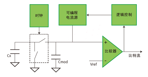時(shí)鐘:本文提到的電容式感應(yīng)系統(tǒng)是基于開關(guān)電容原理的。相反,物理上的傳感器電容通過在連續(xù)周期內(nèi)給傳感器電容充放電模擬成了電阻。模擬電阻和傳感器電容值成正比,可以用電流源和一個(gè)數(shù)模轉(zhuǎn)換器來計(jì)算傳感器電容實(shí)際值。