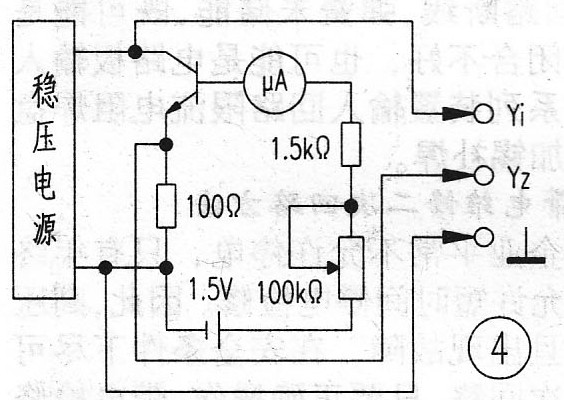 測試方法:把圖4連入示波器,從圖中可以看出:X軸通道信號反映了集電極、發(fā)射極偏置電壓的大小,Y軸通道的信號反映了該電路中三極管Ic的變化,示波器耦合開關(guān)置“DC”擋。斷開1.5V電源,Ib=0,則示波器上出現(xiàn)—條水平亮線。通入1.5V電源,調(diào)整100kΩ電位器值的大小,分別使Ib為20uA、40uA、 60uA、 80uA, 則示波器屏幕上將依次掃描出四條曲線,如圖5所示。由此可以很方便地測出該晶體管的直流放大倍數(shù),并從曲線的線性度上判別管子的優(yōu)劣程度。