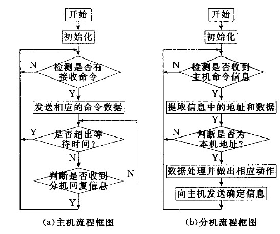 分機(jī)上電復(fù)位后進(jìn)行初始化,然后等待接收主機(jī)發(fā)送的命令信息。接收到命令信息后,從中提取地址和數(shù)據(jù)信息,若為本分機(jī)地址,則對(duì)數(shù)據(jù)進(jìn)行處理并作出響應(yīng),同時(shí)向主機(jī)發(fā)送確定信息;若非本分機(jī)地址,則返回,繼續(xù)等待主機(jī)發(fā)送的命令信息。分機(jī)主程序流程圖如圖6(b)所示。