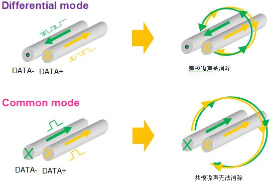 通過濾波器來消除差分傳輸信號線所產(chǎn)生的噪聲的同時,需要選擇具有高效靜噪性能,且不影響波形質(zhì)量的濾波器。在差分傳輸信號線靜噪處理中,使用共模扼流線圈將更加有效。共模扼流線圈對于差分信號不產(chǎn)生任何阻抗,但對于共模信號是一個很大的阻抗,可對過大的共模干擾電流進行有效抑制。