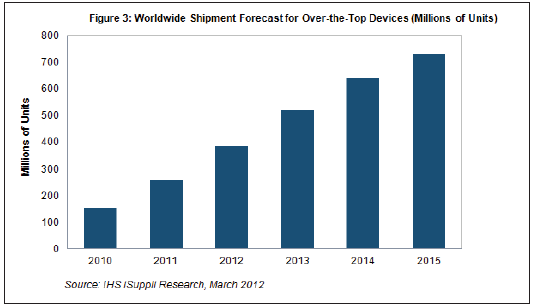 據(jù)IHS iSuppli公司的消費(fèi)平臺(tái)專(zhuān)題報(bào)告,到2015年,支持OTT的產(chǎn)品出貨量預(yù)計(jì)將從2011年的2.58億個(gè)增長(zhǎng)到7.31億個(gè)。今年支持OTT的產(chǎn)品出貨量預(yù)計(jì)將達(dá)到3.848億個(gè),比2011年增長(zhǎng)近50%,如下圖所示。2011年這個(gè)OTT市場(chǎng)強(qiáng)勁增長(zhǎng)68%。