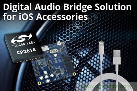 【導(dǎo)讀】近日,Silicon Labs(芯科科技有限公司)宣布,推出一款數(shù)字音頻橋接芯片CP2614和評估套件,旨在簡化iOS設(shè)備配件的開發(fā)以及助力于iOS設(shè)備配件的創(chuàng)新。CP2614為各類使用全數(shù)字閃電連接器的MFi設(shè)備(Made for iPod、iPhone或iPad)提供完整交鑰匙音頻橋接解決方案,同時也包括各類音頻配件。