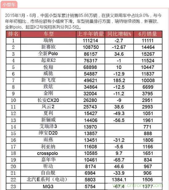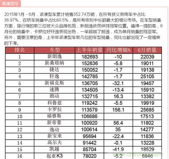 據(jù)中國汽車工業(yè)協(xié)會(huì)發(fā)布的數(shù)據(jù),2015年6月,汽車產(chǎn)銷量環(huán)比下降,同比繼5月后再次雙雙下降;上半年,汽車產(chǎn)銷增速比上年同期明顯回落。說到汽車,小編想到了由我愛方案網(wǎng)承辦的“創(chuàng)業(yè)之星”2015全球創(chuàng)客大賽成都賽場中的一個(gè)參賽項(xiàng)目:智能車載太陽能轉(zhuǎn)化防護(hù)裝置,它改變?cè)扔扇斯ふ周囐M(fèi)時(shí)費(fèi)力方法,完全達(dá)到遙控自動(dòng)罩車,屬于汽車產(chǎn)品領(lǐng)域的一項(xiàng)新技術(shù),歡迎大家到淘方案上了解詳情!下面跟著小編來看看中國汽車在2015年1月-6月的銷量數(shù)據(jù)!歡迎參與互動(dòng)分享!