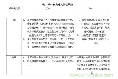 夾球和頂針式的適配座,各有優(yōu)缺點,應(yīng)用在不同場合,如表1所示。