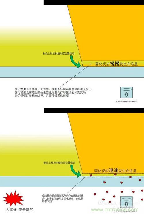 傳統(tǒng)SLA技術(shù)(上圖)與改良的CLIP技術(shù)(下圖)對(duì)比