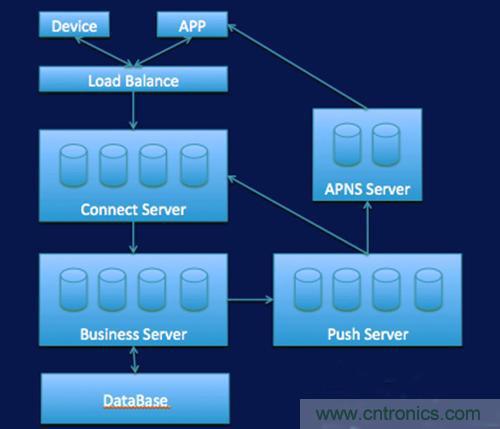 看一下最簡單的IM架構(gòu),這里面要保持長連接,接下來做一些業(yè)務(wù)處理,下面是存儲,如果App要去控制Device的時候,發(fā)到業(yè)務(wù)層處理完了之后,這里面有一個推送的,可以找到Device到底連了哪一臺機,然后再把數(shù)據(jù)推送過來。如果Device自己的狀態(tài)發(fā)生變化,它的數(shù)據(jù)要推送給APP,基本上是這樣的工作流。如果App是黑莓等設(shè)備的,我們可能要專門推送到APNS里面來。