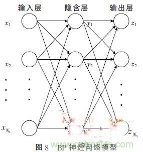 三層BP神經(jīng)網(wǎng)絡(luò)的模型如圖8所示,包括輸入層、隱含層和輸出層,各層間由連接權(quán)值構(gòu)成。BP神經(jīng)網(wǎng)絡(luò)的訓(xùn)練過(guò)程由信號(hào)的正向傳播和誤差的反向傳播兩個(gè)過(guò)程組成,其學(xué)習(xí)的本質(zhì)是各連接權(quán)值的動(dòng)態(tài)調(diào)整。隨著網(wǎng)絡(luò)的不斷學(xué)習(xí),權(quán)值也不斷的調(diào)整,直到誤差減少到可接受的程度或者訓(xùn)練達(dá)到預(yù)定的訓(xùn)練次數(shù)。