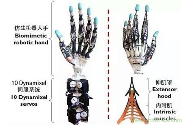 關(guān)節(jié)韌帶(身體用來固定關(guān)節(jié)且控制它們活動范圍的部分)的材料使用了高強度的Spectra帶,并帶有激光切割的橡膠板來代替增加關(guān)節(jié)依從性的軟組織。伸肌和屈肌的肌腱(用來矯直和彎曲手指的部分)也由Spectra帶構(gòu)成,同時用更多的激光切割橡膠板代替了腱鞘和伸肌腱帽,后者是通過包裹手指來使其應(yīng)對靈活性和扭矩的復(fù)雜的蹼狀多層結(jié)構(gòu)。UW(華盛頓大學(xué)縮寫)手的最后一部分構(gòu)成是肌肉,它是由一排10個Dynamixel伺服系統(tǒng)組成,它們的電纜布線也緊密的模仿了人手的腕隧道。