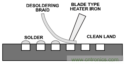 去錫。利用吸錫線和刀片型烙鐵去除焊盤(pán)上過(guò)多的焊料(參見(jiàn)圖6)。所選刀片的寬度應(yīng)與器件占用的最大寬度相匹配。刀片溫度必須足夠低,以避免損壞電路板??蓪⒑竸┩吭诤副P(pán)上,然后用吸錫線和烙鐵去除過(guò)多焊料。