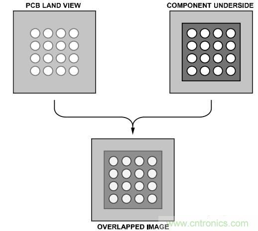 將器件精準(zhǔn)貼放到電路板上是很重要的。帶分光束光學(xué)系統(tǒng)的貼片設(shè)備有助于PBGA和電路板的對(duì)齊。此類(lèi)成像系統(tǒng)涉及到將PBGA焊球鏡像疊放在PCB焊盤(pán)鏡像上(參見(jiàn)圖10)。貼片機(jī)必須具有支持用戶(hù)沿x軸和y軸進(jìn)行微調(diào)(包括旋轉(zhuǎn))的能力。
