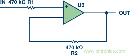 電阻熱噪聲的計(jì)算公式為√4kTRB,故1 kΩ電阻會(huì)有4 nV/√Hz的噪聲。增加電阻會(huì)增加噪聲。在圖2中,出人意料的是,雖然909 Ω補(bǔ)償電阻是值最低的電阻,但由于從該節(jié)點(diǎn)到輸出端的噪聲增益,它給圖2輸出端貢獻(xiàn)的噪聲最多。R1引起的輸出噪聲為40 nV/√Hz,R2為12.6 nV/√Hz,R3為42 nV/√Hz。因此,請(qǐng)勿使用電阻。另一方面,如果運(yùn)算放大器采用雙電源供電,并且一個(gè)電源先于另一個(gè)電源上電,那么ESD網(wǎng)絡(luò)可能發(fā)生閂鎖問(wèn)題。這種情況下,可能希望增加一定的電阻來(lái)保護(hù)器件。但若使用的話,應(yīng)在電阻上放置一個(gè)旁路電容以減少電阻的噪聲貢獻(xiàn)。