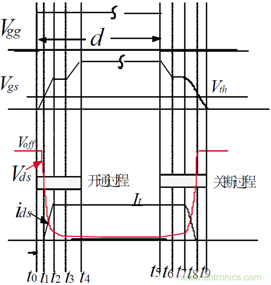 -- [t0-t1]區(qū)間,MOSFET 的GS 電壓經(jīng)Vgg 對Cgs充電而上升,在t1時刻,到達維持電壓Vth,MOSFET 開始導(dǎo)電;