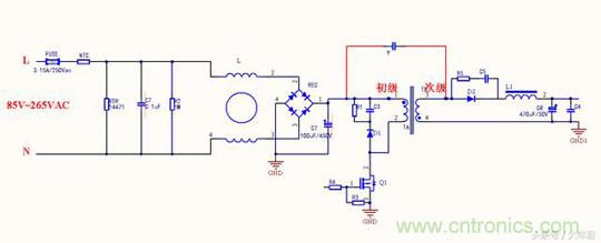 變壓器的每個線圈繞組之間有寄生電容存在,在工作時過程當中形成電壓,成為噪聲源頭,在初始高壓與次級地之間跨接Y電容,能濾除初級和次級耦合產(chǎn)生的共模干擾,這與第一種差不多,只是在EMI測試時候結(jié)果會有所不同。