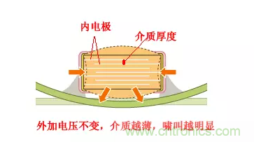 陶瓷介質(zhì)是MLCC主要組成部分,電壓作用下,電致伸縮不可避免。如電致伸縮強烈表現(xiàn)為壓電效應(yīng),則會產(chǎn)生振動。