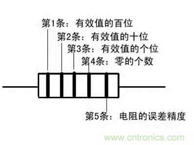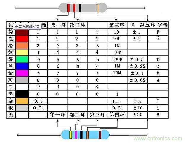 電阻器上用不同顏色的環(huán)來(lái)表示電阻的標(biāo)稱(chēng)阻值,常見(jiàn)的電阻器有四色環(huán)電阻和五色環(huán)電阻。四色環(huán)電阻,一般是碳膜電阻,用三個(gè)色環(huán)來(lái)表示阻值,用一個(gè)色環(huán)表示誤差。五環(huán)電阻一般是金屬膜電阻,精度更高,常用四個(gè)色環(huán)表示阻值,另一個(gè)色環(huán)表示誤差。
