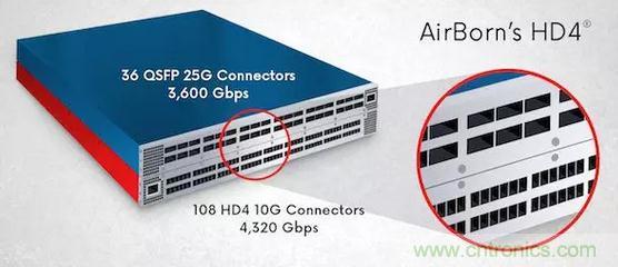 圖2:針對(duì)高密度設(shè)計(jì)的AirBorn 10GHD4®連接器可在同一托架系統(tǒng)內(nèi)提供比25G QSFP連接器更高的吞吐量,從而實(shí)現(xiàn)組件和能源成本節(jié)省。
