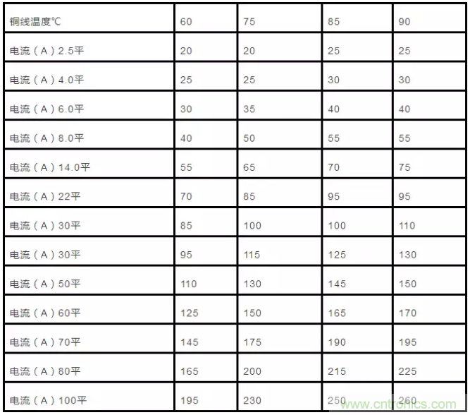 下面是銅線在不同溫度下的線徑和所能承受的最大電流表格。