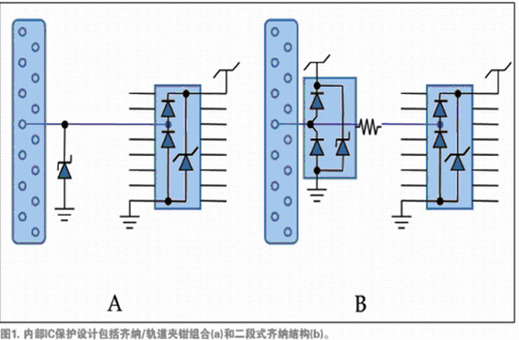 例如,與信號輸入相關(guān)的IC焊墊的特點(diǎn)是齊納二極管和結(jié)型鉗位二極管連接供電軌(圖1a),或者兩段式齊納鉗位二級管連接地面(圖1b)。多供電軌的IC需要使用軌道夾鉗阻止軌道在高速電流瞬變時擴(kuò)散。