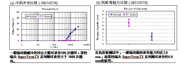 柔性端頭SuperTerm系列產(chǎn)品在板彎測(cè)試中產(chǎn)生破壞時(shí),其破壞模式是開(kāi)路模式,而。一般端電極開(kāi)路或短路模式都會(huì)產(chǎn)生 。柔性端頭SuperTerm系列中的彈性層可從剖面圖中看見(jiàn),其成份中含有〝高分子銀〞以產(chǎn)生此彈性效果。