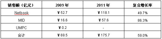 賽迪顧問預(yù)測(cè),未來3年中國超移動(dòng)筆記本電腦市場(chǎng)銷量將保持快速,2011年市場(chǎng)容量有望達(dá)到175.7億元人民幣。預(yù)計(jì)2009-2011年,中國超移動(dòng)筆記本電腦市場(chǎng)銷售額的年均復(fù)合增長水平將達(dá)到59.0%。
