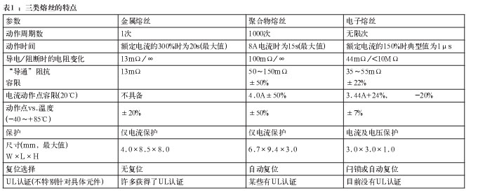 聚合物器件以導(dǎo)電型塑料制成,這些器件在電流(內(nèi)部熱量)達到預(yù)設(shè)定的電平時會改變它們的阻抗。這些器件也經(jīng)常與TVS器件一起使用,就像金屬熔絲那樣。電子熔絲是半導(dǎo)體電路,控制功率開關(guān)(通常是功率MOSFET),并按照預(yù)設(shè)的參數(shù)改變其阻抗。表1簡單比較了這三類熔絲。
