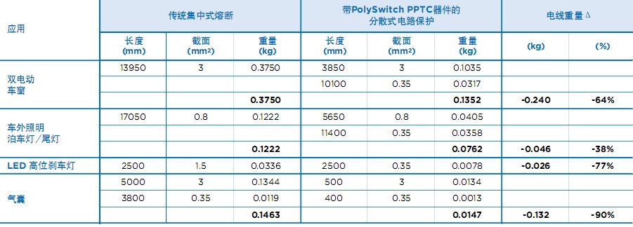 表. 傳統(tǒng)熔斷與分散式線束保護(hù)架構(gòu)的電線重量比較。電線重量計(jì)算以銅密度8.96x10-6kg/mm3為依據(jù)