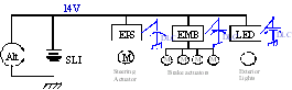 在這個(gè)高度簡(jiǎn)化的描述中,超級(jí)電容分布模塊或雙層電容(DLC)緊靠高耗能用電負(fù)載,如EPS(1.2KW)、電子機(jī)械剎車(1到2KW)和新型照明系統(tǒng)(如最近出現(xiàn)的白光LED頭燈)。本地分布式模塊為高峰負(fù)載供電,避免造成來(lái)自交流發(fā)電機(jī)和電池的14V電源線出現(xiàn)強(qiáng)烈的波動(dòng)。