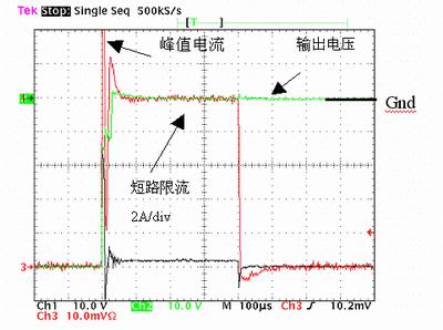 如果我們采用一個32mΩ的NTB52N10T4、100V的FET及一個5mΩ的感應電阻,在短路時FET的電流將被限制在10A,超過500μs斷路器就會關(guān)閉FET。圖2顯示-48V應用中的短路波形。