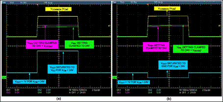 圖2是當(dāng)移走D1時,35V拋負載脈沖下放大器的輸出。施加電壓為電池標(biāo)稱電壓,所要求的輸出電壓為1V (輸入VSENSE = 50mV、增益 = 20)。出現(xiàn)拋負載電壓時,齊納管把輸入共模電壓鉗位在大約24V,放大器輸出經(jīng)過幾個短暫的波動后穩(wěn)定到0V。