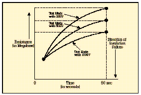 在短時(shí)測(cè)試中,兆歐表被直接跨接在被測(cè)設(shè)備上,施加大約60秒的測(cè)試電壓。為了在大約一分鐘的時(shí)間內(nèi)使絕緣值讀數(shù)達(dá)到穩(wěn)定,應(yīng)該只對(duì)低容性的設(shè)備進(jìn)行該項(xiàng)測(cè)試?;镜倪B接步驟和驗(yàn)證測(cè)試時(shí)相同,所施加的電壓按DC測(cè)試電壓公式進(jìn)行計(jì)算。當(dāng)測(cè)試好的設(shè)備時(shí),您會(huì)注意到,隨電容容量和吸收電流的降低,絕緣阻抗值會(huì)穩(wěn)定上升。由于溫度和濕度會(huì)影響測(cè)試結(jié)果,應(yīng)該在標(biāo)準(zhǔn)溫度(大約20?C/68?F)下、露點(diǎn)之上的環(huán)境下進(jìn)行測(cè)試。 當(dāng)設(shè)備的額定值等于或小于1000伏特時(shí),絕緣讀數(shù)應(yīng)該為1MΩ或更高。當(dāng)設(shè)備額定值高于1000伏特時(shí),理想的阻抗應(yīng)該為每1000伏特上升1MΩ。所測(cè)量的絕緣阻抗值通常會(huì)略低于以前記錄的值,其下降的趨勢(shì)規(guī)律如圖6所示。絕緣值下降的斜率是絕緣材料老化程度的正常信號(hào)。陡峭的下降斜率是絕緣失效或可能出現(xiàn)故障的先兆。
