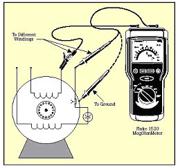當(dāng)測(cè)試定子馬口鐵的阻抗時(shí),要確保定子繞組和定子相是斷開的。測(cè)量繞組之間以及繞組和地之間的絕緣電阻。還有,當(dāng)測(cè)量DC發(fā)電機(jī)或馬達(dá)時(shí),應(yīng)該將電刷提高,這樣,就能將馬口鐵和電樞分開來(lái)測(cè)量。下表列出了推薦的在不同的馬達(dá)額定電壓下的最小阻抗讀數(shù)