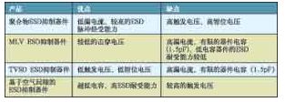 表 1給出了在靜電放電抑制器件中常用的幾種核心技術的優(yōu)點和缺點對比。聚合物靜電放電抑制器件在各種技術中可提供最低的漏電流,可承受非常高的靜電放電電壓脈沖,但在多次靜電放電事件后器件會開始降級。除此之外,該類器件相對高的觸發(fā)電壓和鉗位電壓(比空氣間隙放電產(chǎn)品高出50~100倍)則意味著更多的靜電放電脈沖能量可以通過被保護的電路。