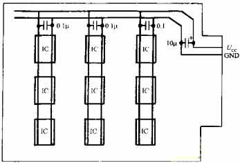 在單片機測控系統(tǒng)中使用了大量的數字IC,而每片數字IC本身都是一個脈沖干擾源,它們也會通過電源線相互干擾。解決辦法是在印制板電源進線端并聯一只10UF~100UF鉭電容進行電源退耦,同時在每個芯片的電源進線端再并聯一只高頻、低分布的電感的陶瓷電容,容量一般取0.1UF,當頻率超過15MHZ時,可取0.01JF,電路如圖所示。退耦電容的引腳要盡量短。