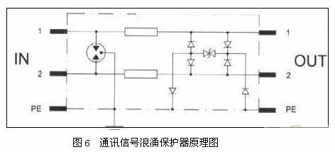 BAx系列信號浪涌保護器是專為通過雙絞線進行信號傳輸?shù)脑O(shè)備而設(shè)計,以保護其避免遭受感應(yīng)過電壓和操作過電壓的損害。該浪涌保護器輸入、輸出采用RJ45公/母于接頭串聯(lián)保護。網(wǎng)絡(luò)信號浪涌保護器原理圖見圖5所示。